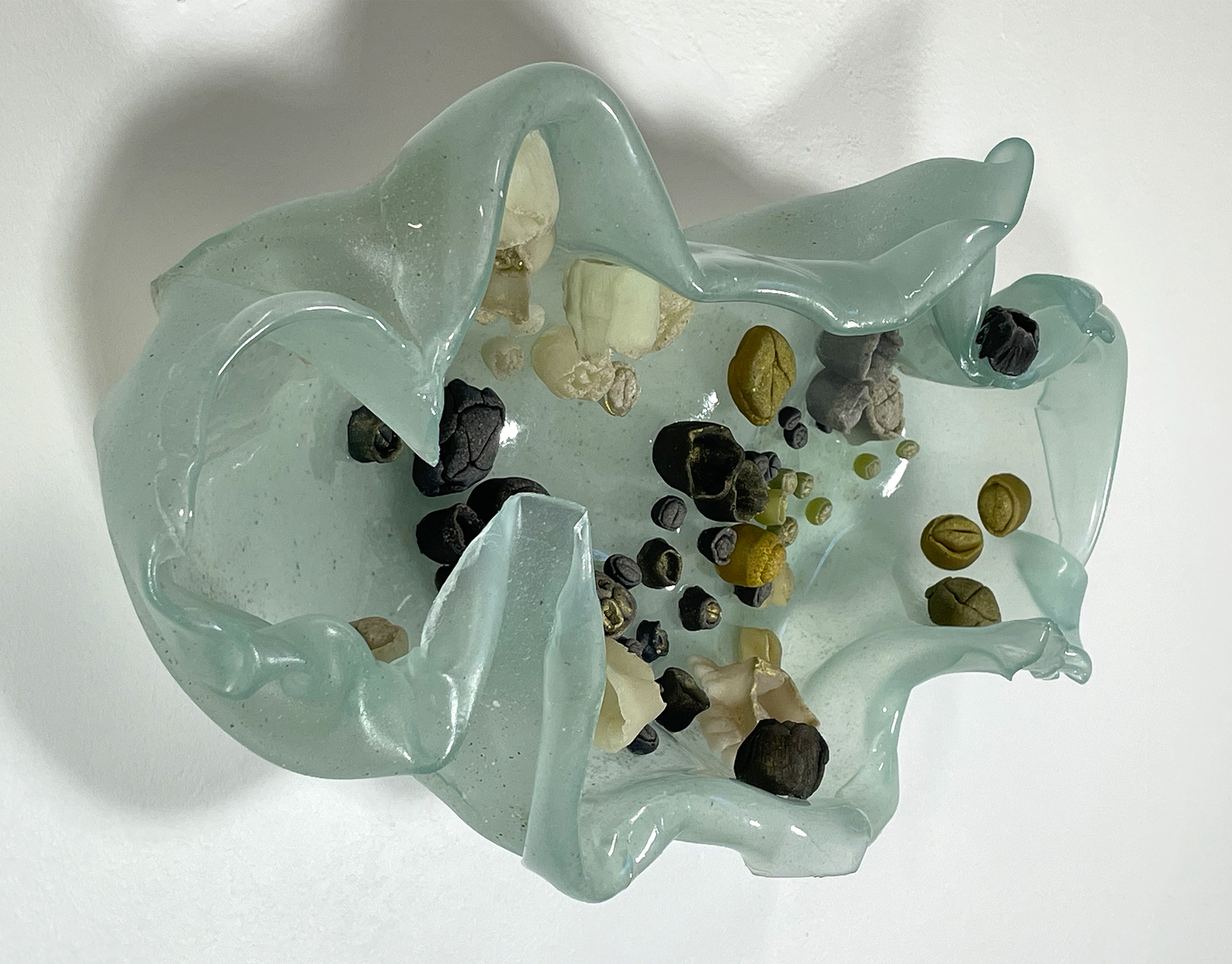 Beneath Meeting Tides, resin, ground shell, gold leaf, 20x18x8 inches, 2025